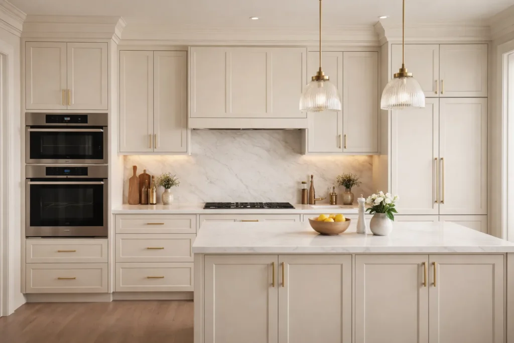 Color controls mood more than decoration. Sophisticated kitchens rely on calm, layered tones rather than strong contrast.