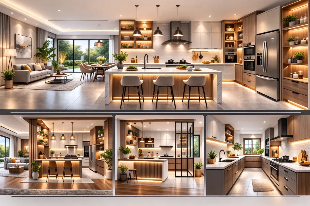 - Integrate smart storage, built-in appliances, and natural textures for a seamless, cohesive design.