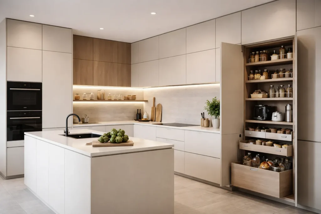 Handleless or integrated-handle cabinets create a seamless appearance and reduce visual clutter. Tall pantry units and concealed compartments maintain a clean look because everyday items remain hidden.