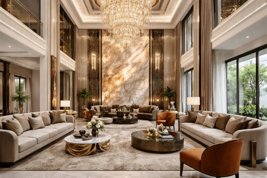 The living room is the heart of a luxury villa, designed to reflect grandeur, comfort, and refined elegance.