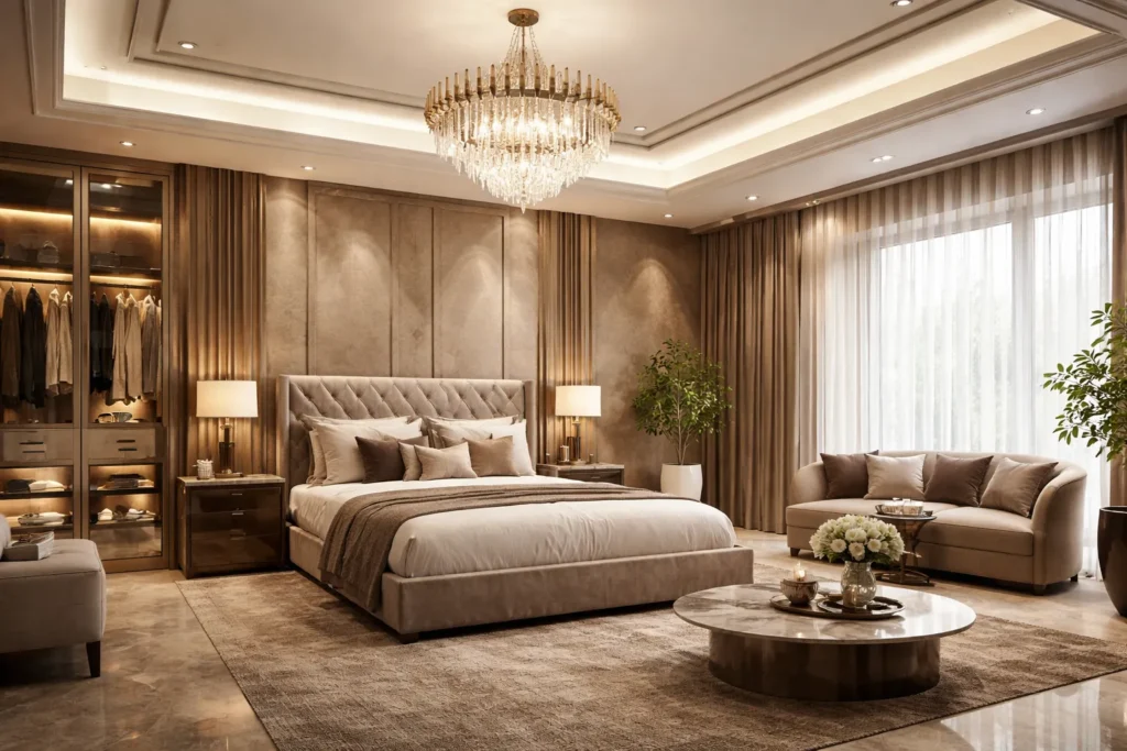 A master bedroom in a luxury villa should feel like a private five-star retreat, designed for comfort, elegance, and relaxation.
