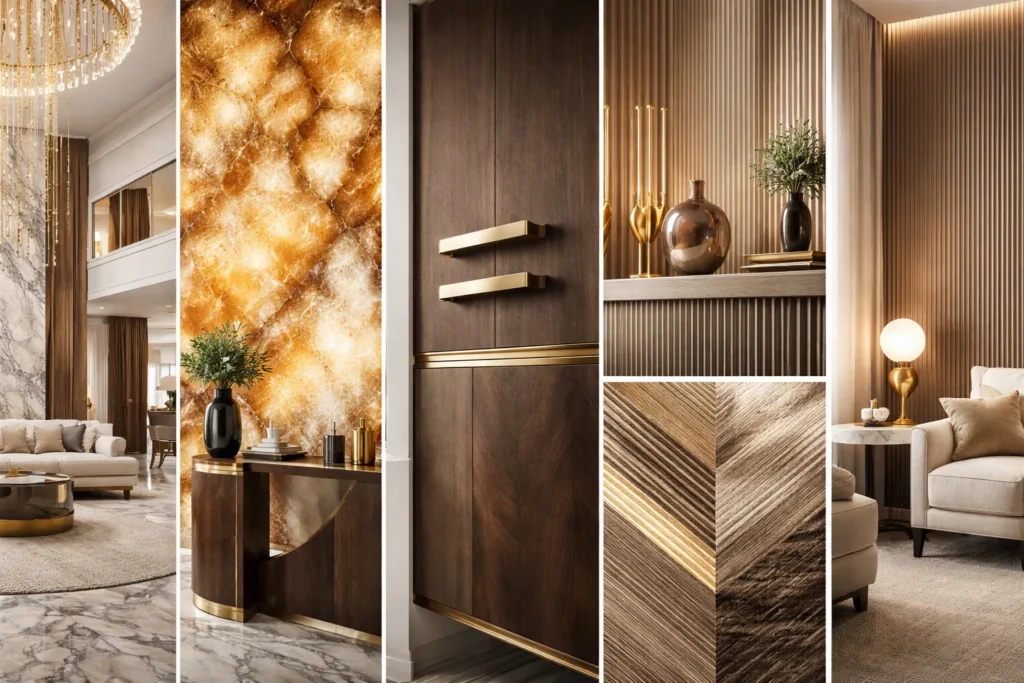 • Premium Materials & Finishes: High-end materials such as Italian marble, onyx panels, natural wood veneer, brass accents, and textured wall finishes define true luxury.